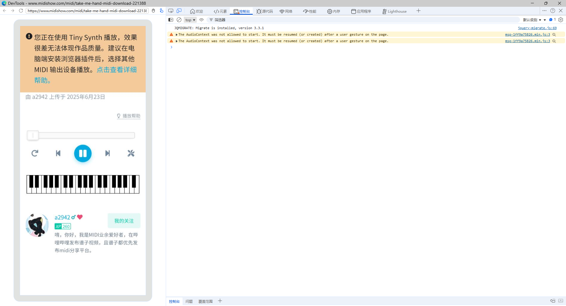 Windows端没这个情况,貌似就安卓出现了问题,而且安卓chrome也没有控制台之类的功能,目前只能确认和“midi设备控制权限”有关